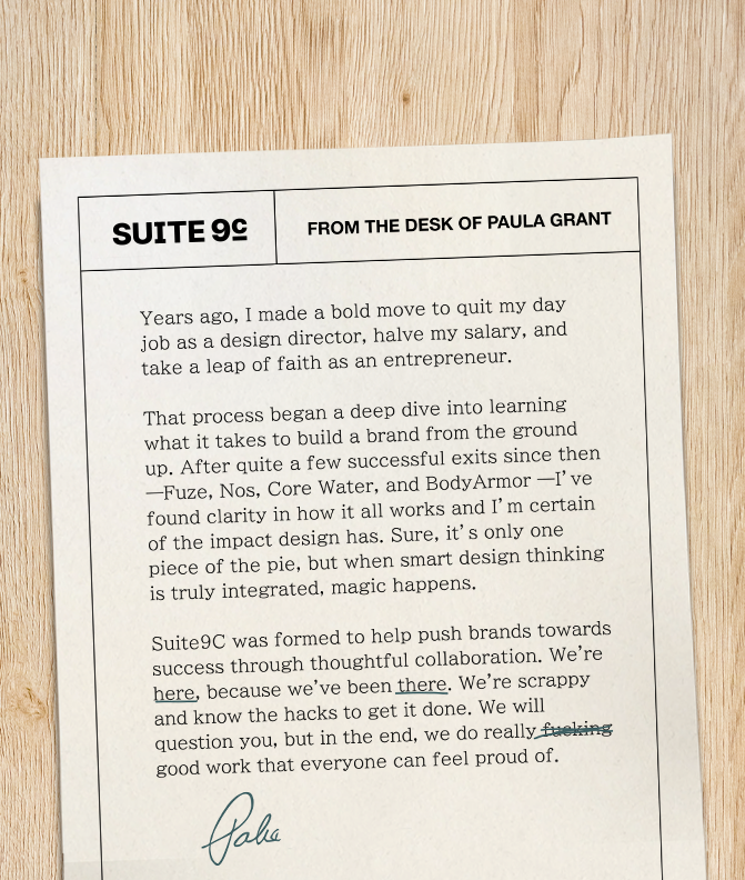 Suite9c is a creative studio working somewhere near the intersection of brand, packaging, strategy, content and digital. We collaborate and invest (literally and metaphorically) with clients who become friends, on projects that begin as startups and go on to successful exits.